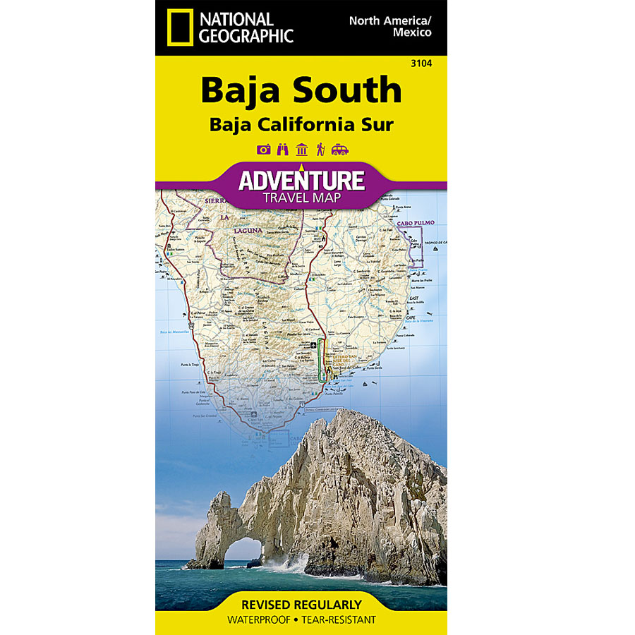 The Baja South map covers from Guerro Negro to the tip at Cabo San Lucas. There are awesome topo details like mountain regions, washes and other water spots, dry lake beds, and elevation. Nat. Geo offers a scale of 1:450,000 with a latitude/longitude grid.